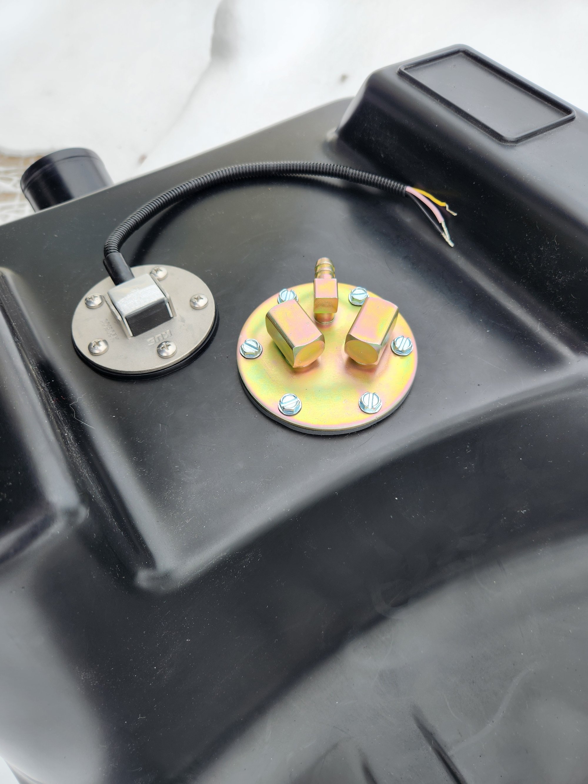 This combo provides the installer a straight-forward method to connect the factory external fuel pump (or aftermarket external fuel pump) to the poly tank with their own choice of fuel hoses and adapters. The VTS fuel sender can be used with the factory fuel gauge or any aftermarket ohms programmable fuel gauge (see the Fuel Sender page for more info).